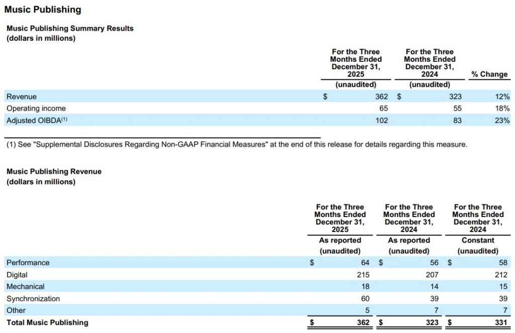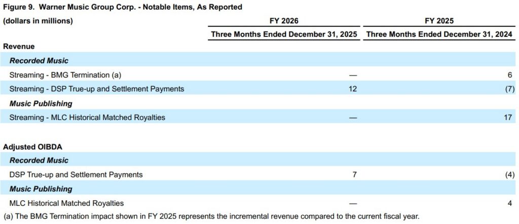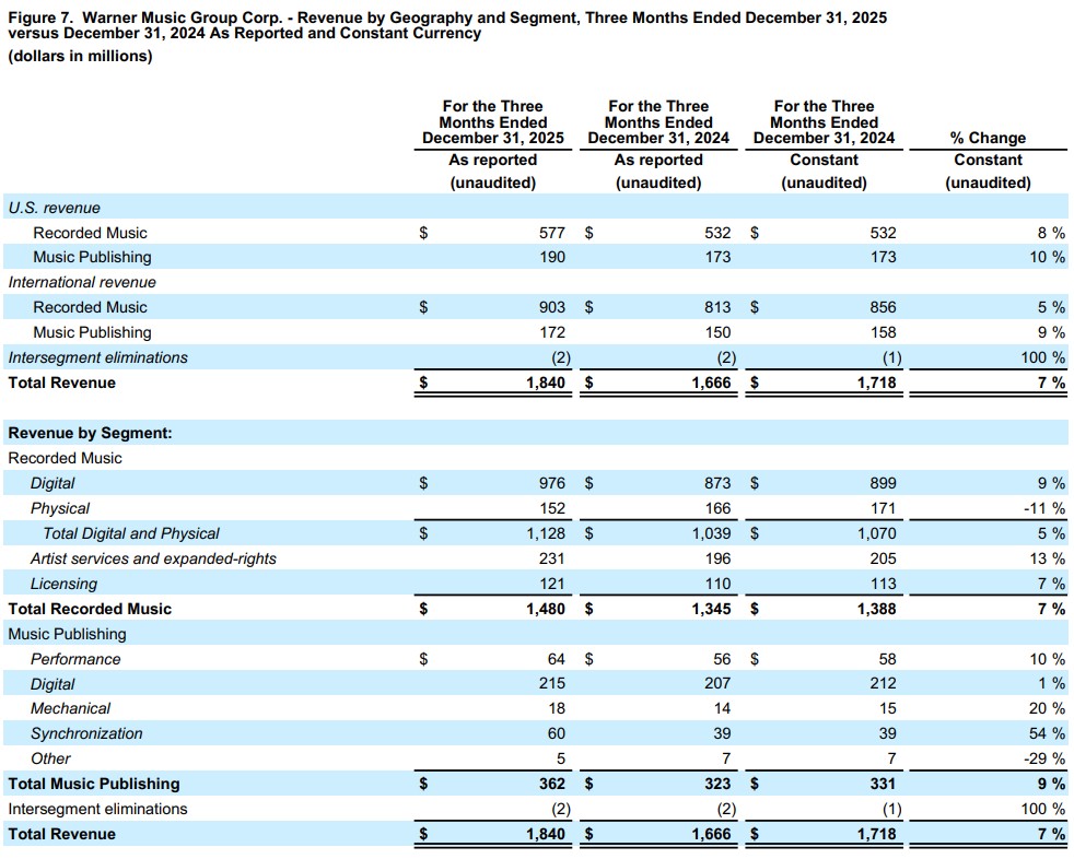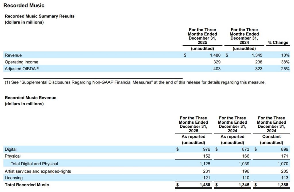 Recorded Music revenue was up 10.0% (or 6.6% in constant currency) driven by increases across digital, artist services and expanded-rights and licensing revenue, partially offset by a decrease in physical revenue. Excluding the impacts of the DSP True-Up and Settlement Payments of $12 million in the quarter and $7 million in the prior-year quarter, as well as the $6 million impact of the BMG Termination, Recorded Music revenue was up 9.1% (or 5.7% in constant currency). Digital revenue was up 11.8% (or 8.6% in constant currency) and streaming revenue was up 12.4% (or 9.1% in constant currency). Adjusted for the impacts of the DSP True-Up and Settlement Payments of $12 million in the quarter and $7 million in the prior-year quarter, as well as the $6 million impact of the BMG Termination, Recorded Music digital revenue was up 10.3% (or 7.1% in constant currency) and streaming revenue was up 10.9% (or 7.6% in constant currency). Streaming revenue reflects growth in subscription revenue of 14.3% (or 10.9% in constant currency) and in ad-supported revenue of 7.2% (or 3.9% in constant currency). Subscription revenue, adjusted for the impacts of the DSP True-Up and Settlement Payments of $12 million in the quarter and $7 million in the prior-year quarter, as well as the $5 million impact of the BMG Termination, was up 12.0% (or 8.7% in constant currency). Ad-supported revenue, adjusted for the $1 million impact of the BMG Termination, was up 7.7% (or 4.4% in constant currency). The increase in subscription revenue reflects positive market share trends and chart performance, while the increase in ad-supported revenue reflects strong performance in the quarter. Artist services and expanded-rights revenue was up 17.9% (or 12.7% in constant currency) due to higher concert promotion revenue primarily in France, and the favorable impact of foreign currency exchange rates of $9 million. Licensing revenue increased 10.0% (or 7.1% in constant currency) driven by higher licensing activity and a $2 million increase in copyright infringement settlements in the quarter. Physical revenue decreased 8.4% (or 11.1% in constant currency) primarily driven by strong releases in Japan and Korea in the prior-year quarter. Top sellers in the quarter included Alex Warren, sombr, Cardi B, Ed Sheeran, and Teddy Swims.